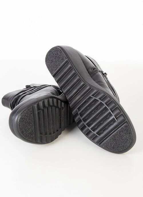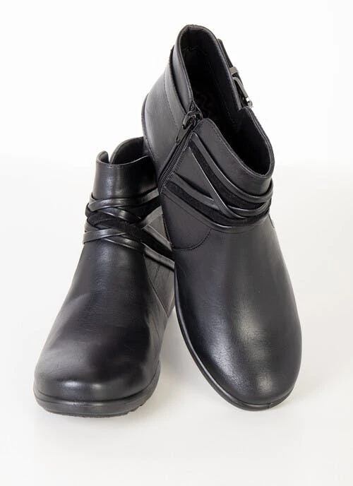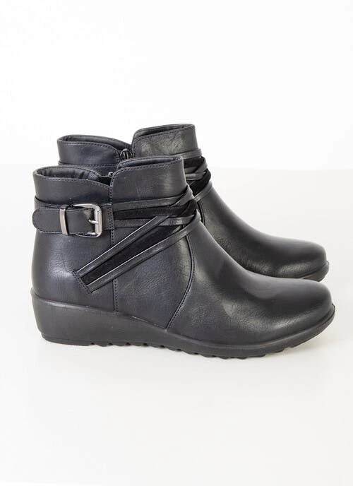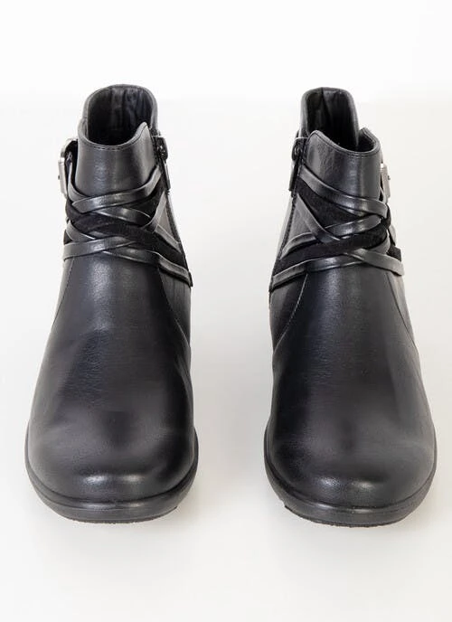 Black ankle boots with crossover strap and buckle detail and inside zip fastening. Cushioned insole for added comfort.