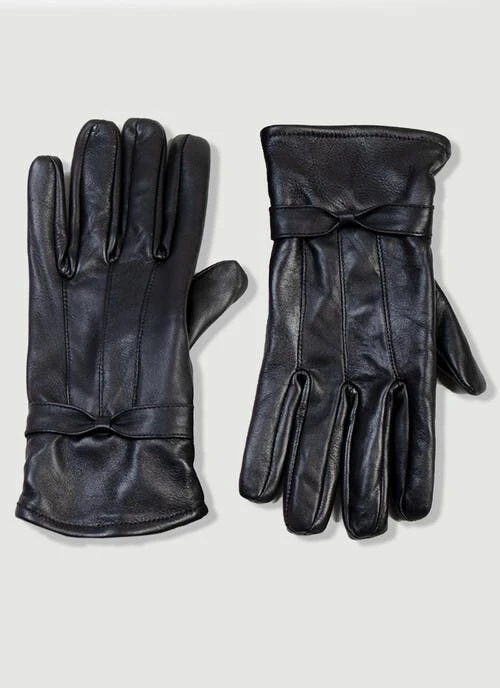 Black leather gloves with bow detail and a fleece lining for extra warmth.