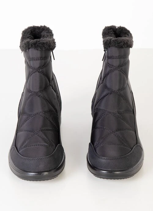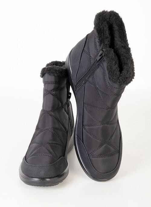 Black quilted ankle boots with inside zip fastening and cosy faux fur lining for extra warmth.