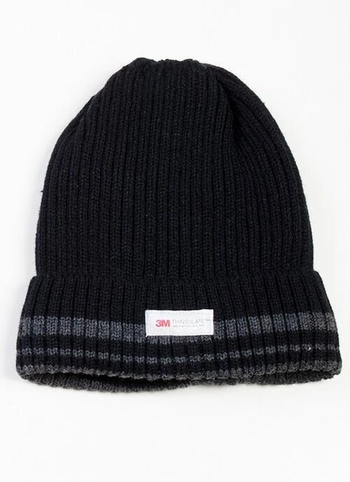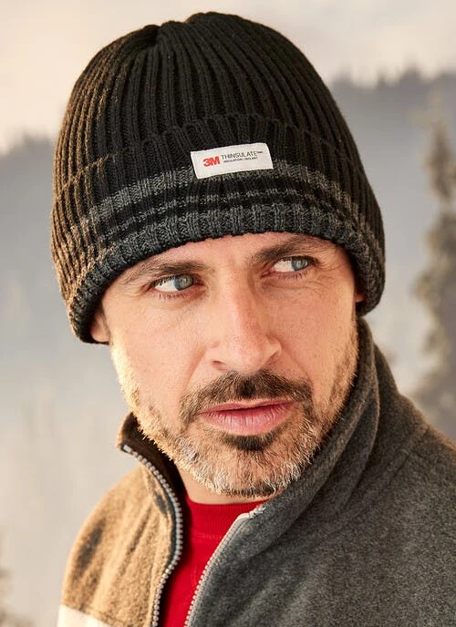 Keep warm with this knitted Thinsulate stripe hat featuring a turn up for extra warmth round the ears. 3M Thinsulate insulated hat is fully lined. Available in three colours, Black , Grey , Navy , and Green .