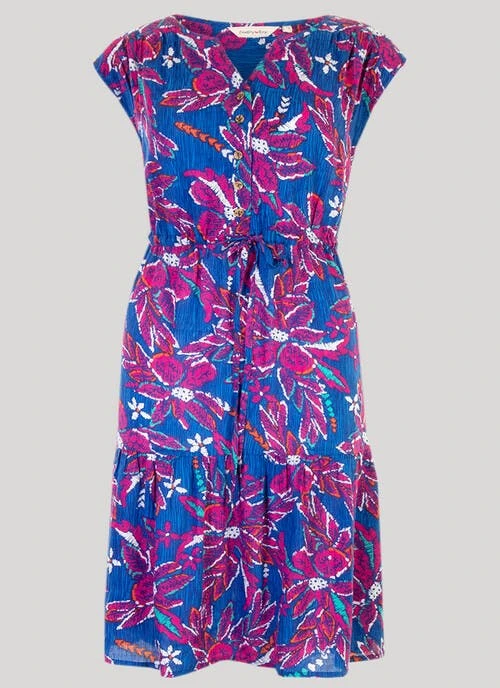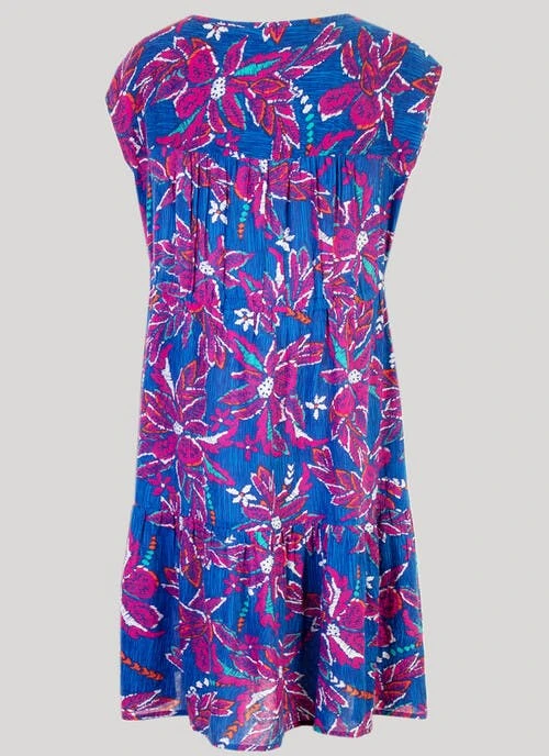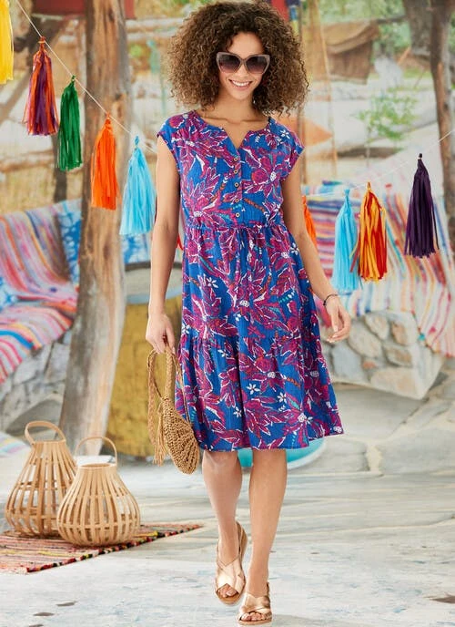 This soft tiered Aztec print dress is an easy wardrobe addition. Featuring an drawstring waist, button front and soft shoulder detailing , the shape is flattering and practical. Wear with your favourite sandals and enjoy the sun.
