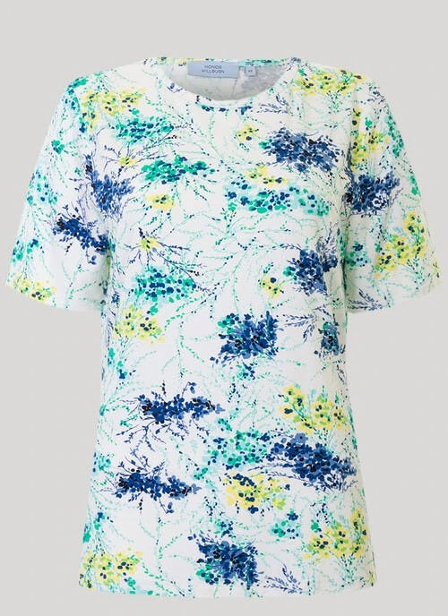 Top with rounded neckline, short sleeves and a pretty floral print. This comfortable and smart top is useful for that special occasion or a weekend with friends. Coordinate with Honor Millburn Collection Trouser and Skirts.