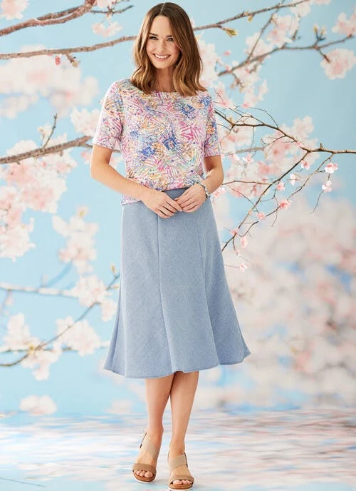 Skirt, fully lined, with waist-elastication for maximum comfort and fit with attractive flare at the hem. Pair this skirt with coordinating garments from the Honor Millburn Collection for a fresh new season look.