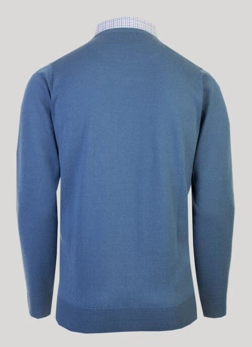 This blue V neck fine knit jumper by James Pringle has a mock 100% cotton shirt insert giving you a layered look. Available in the new seasons colours.