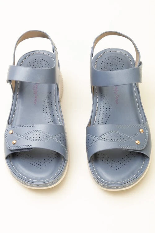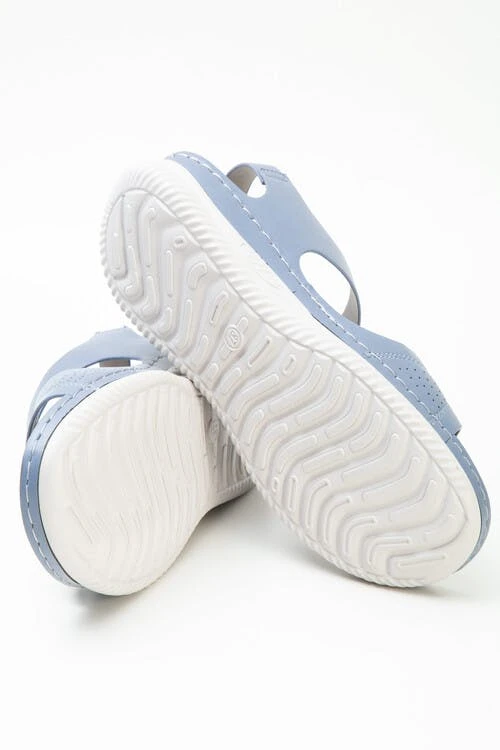 Velcro strap summer sandal in blue with comfort sport style wedge, great for holidays or sunny days at home, with easy touch and close fastening for an adjustable fit.