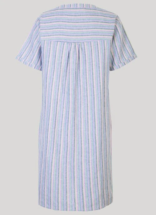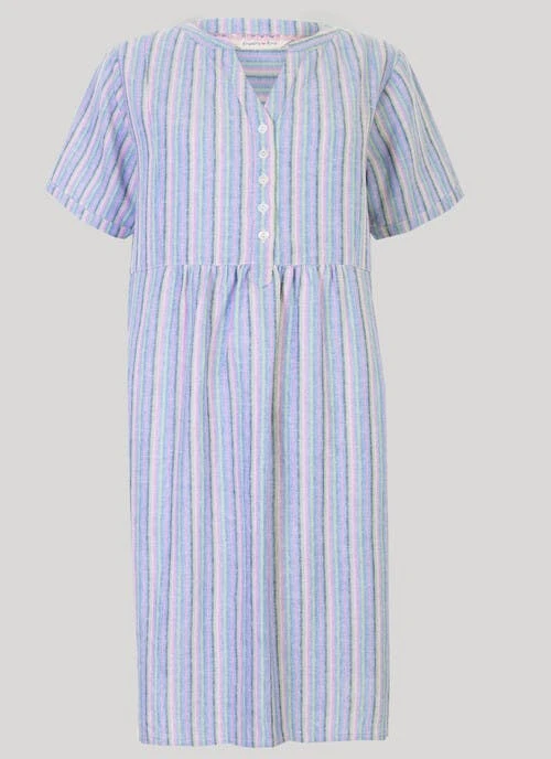 This striped dress is an easy wardrobe addition. Featuring two functioning front pockets, etched coconut buttons and a contemporary yarn dyed stipe pattern , the shape is flattering and practical. Wear with your favourite sandals and enjoy the sun.