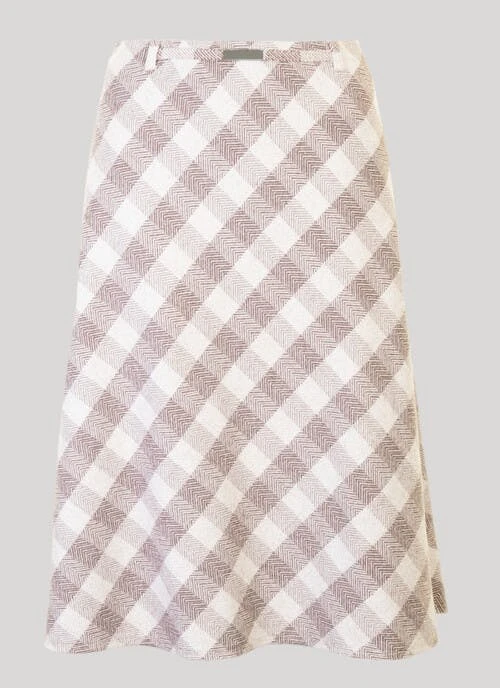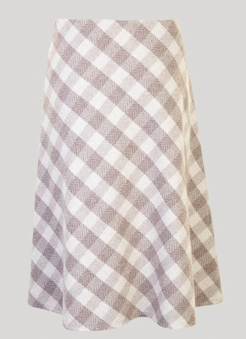 Here we have an Elegant Skirt, fully lined, with waist elastication for maximum comfort and fit. Attractive check cut on the bias creating a flattering flare at the hem. Pretty Silver trim at the front waistband. Pair this skirt with coordinating garments from the Honor Millburn Collection for a fresh new season look.