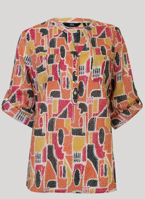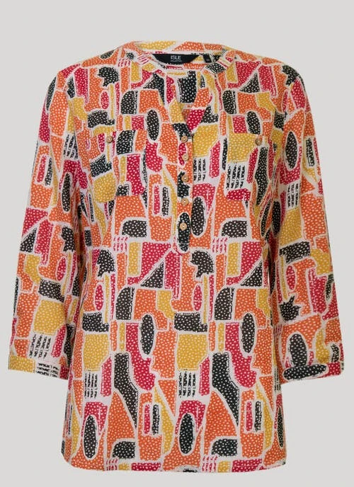 This geo print blouse from Isle is the perfect piece for your summer wardrobe. With it’s soft mandarin neckline, tab-up sleeves and cotton base, you really can’t go wrong with this effortless style. Simply pair with denim to complete the look.