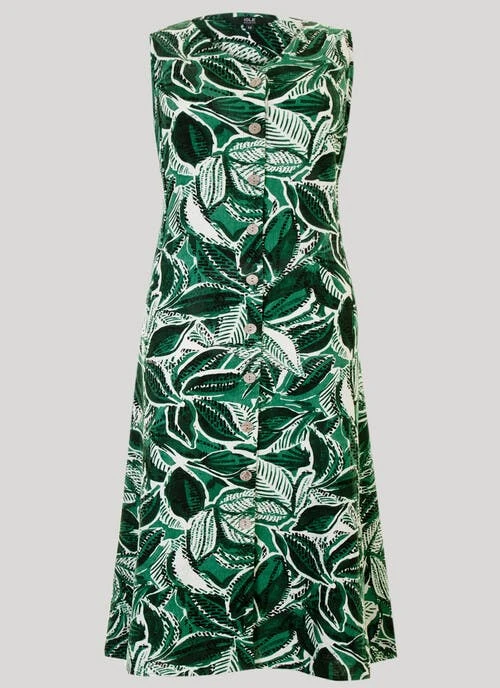 This leaf inspired print dress is an easy wardrobe addition. Made from a linen blend woven fabric and featuring a v neck and button front detailing, the shape is flattering and practical. Wear with your favourite sandals and enjoy the sun.