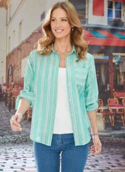 This easy stripe blouse from Isle is the perfect transitional piece for your wardrobe. Made with 100% cotton featuring three-quarter length tab up sleeves and a stylish front pocket, you really can’t go wrong! Simply pair with denim to complete the look.
