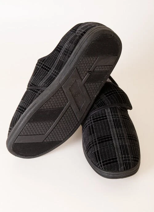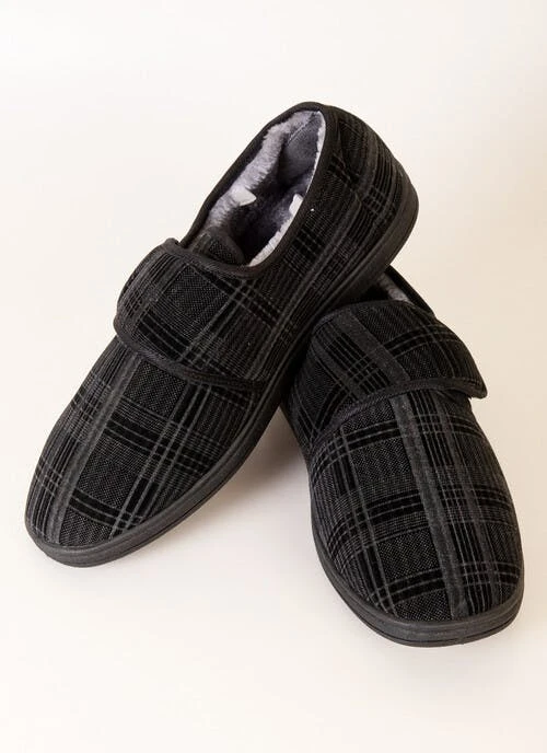 Grey check slipper with practical velcro fastening and cosy faux fur lining for extra warmth.