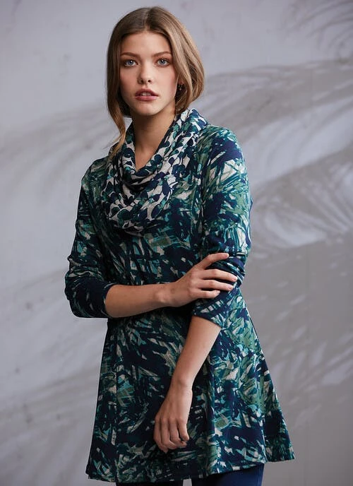 This soft brushed tunic is perfect for pairing with jeggings. The easy to wear fit and flare shape is comfortable and stylish. We have finished off the top with a detachable snood, great to wear with other outfits.