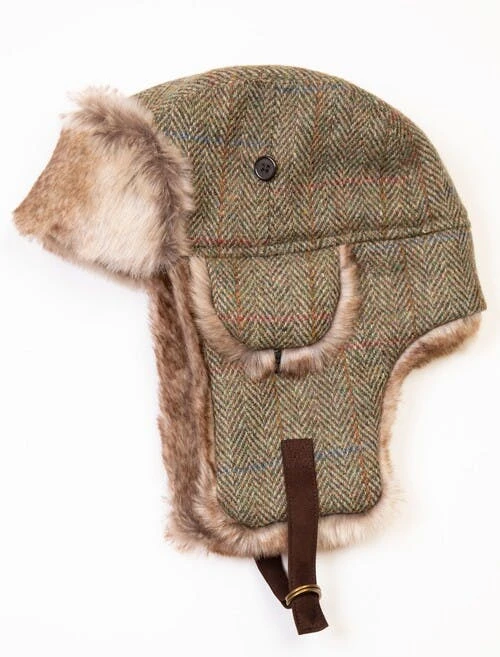 Crafted from the iconic HARRIS TWEED fabric in 100% pure virgin wool, dyed and finished in Scotland’s Western Isles. This trapper hat trimmed with faux fur, popper studs to hold ear flaps, a turn back peak, perfect to give you the country look while keeping you nice and warm.