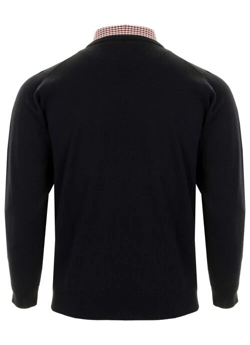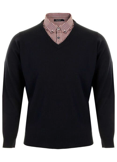 This wine V neck fine knit jumper by James Pringle has a mock 100% cotton shirt insert giving you a layered look. Available in the new seasons colours.