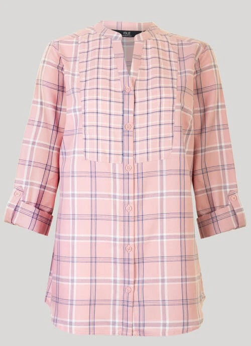 This pretty check blouse from Isle Collection is a must have addition to your casual wardrobe. Delicate pin tuck detailing and a flattering silhouette make this an this easy style. Great with denim.