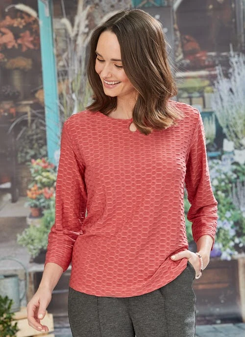 Smart keyhole neck Top. Flattering, comfortable, and made in a jacquard fabric. Classic and elegant, this 3/4 sleeve top is a great wardrobe addition, coordinating with both casual and smart dressing. Team with other Honor Millburn Collection items.