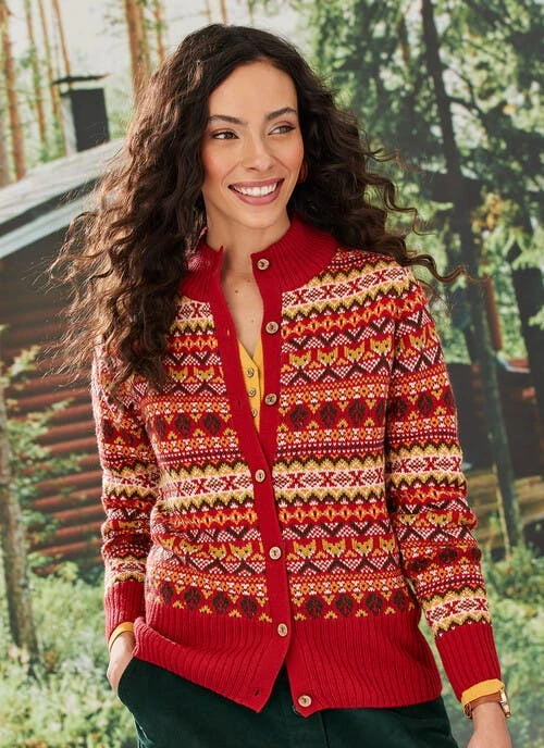 This contemporary Fairisle cardigan is a much needed statement piece to add inspiration to your wardrobe. If the flattering colourway is not enough to charm you, the super soft yarn and cosy feel will win you over. Pair with denim for an effortless look.