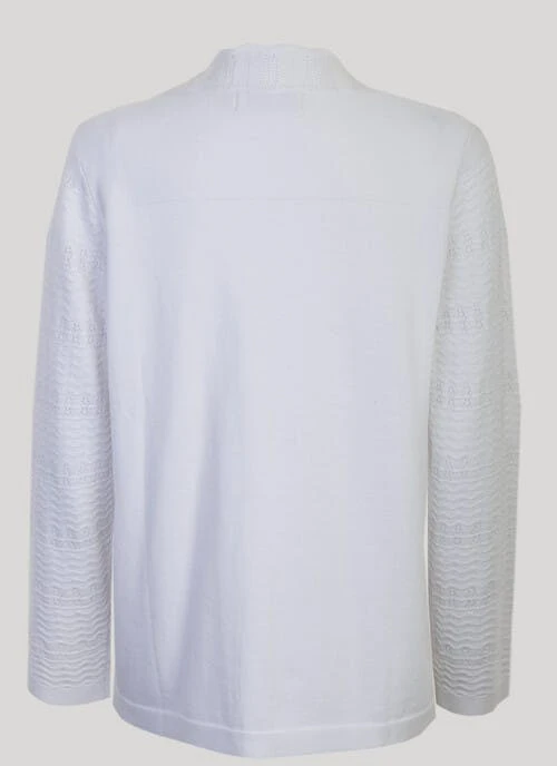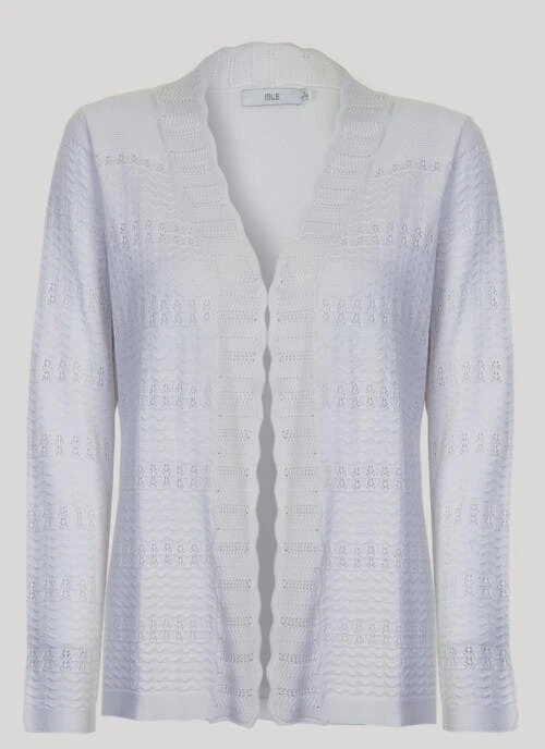 Layer up in style in this scalloped edge to edge cardigan by Isle. Designed with intricate stitch detailing, style with a dress or with jeans for a smart casual look.