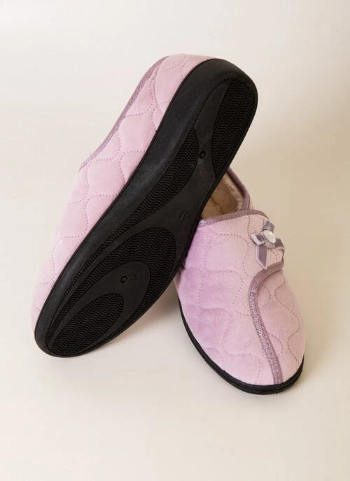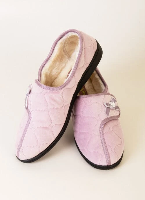 Soft pink velvet slipper with quilting detail, velvet bow with sparkly gemstone centre and practical velcro fastening. Lined with a supersoft faux fur and cushioned for comfort.