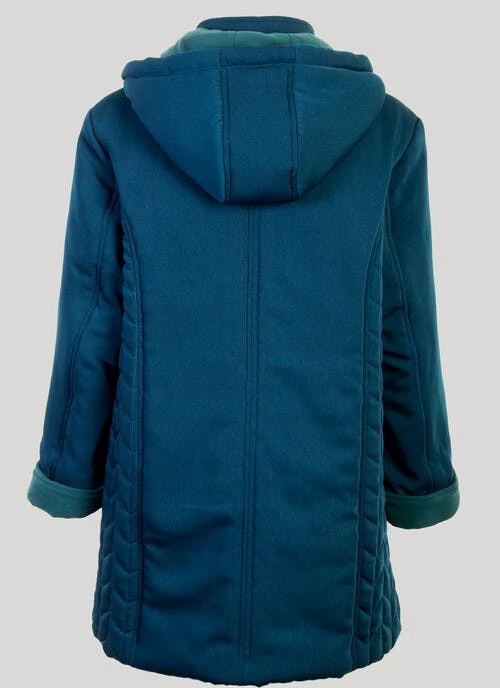Warm kneed length quilt padded coat with contrast turn back cuff and hood lining, double collar and high shine trims. Comfortable traditional fit made in a twill woven fabric. An excellent new addition to your winter wardrobe.