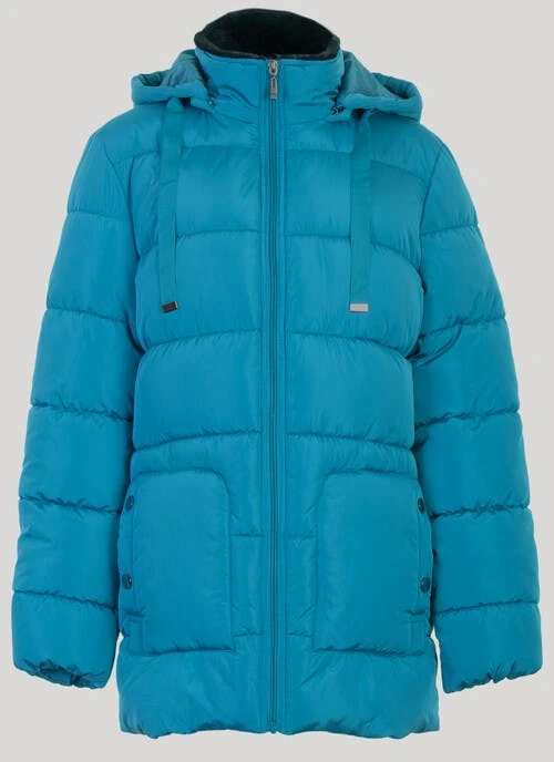 Modern quilted coat with fur trim inner collar. Hi Shine gold trims on the pocket flaps, front placket, zip pull, and hood toggles. Removable hood for customer choice and end use. Comfortable and flattering fit. A great buy for the new season.