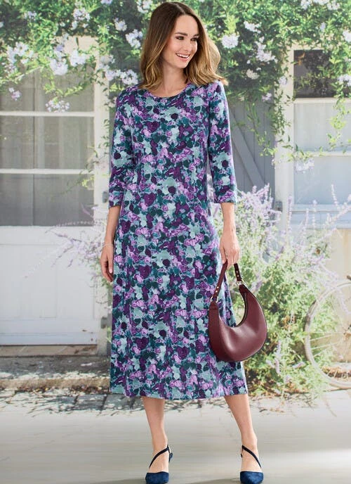 Lovely dress with round neckline, 3/4 sleeve and elegant flare at the hemline. Made in a soft touch brushed jersey with a contemporary and flattering print. An excellent choice to update your new season wardrobe.